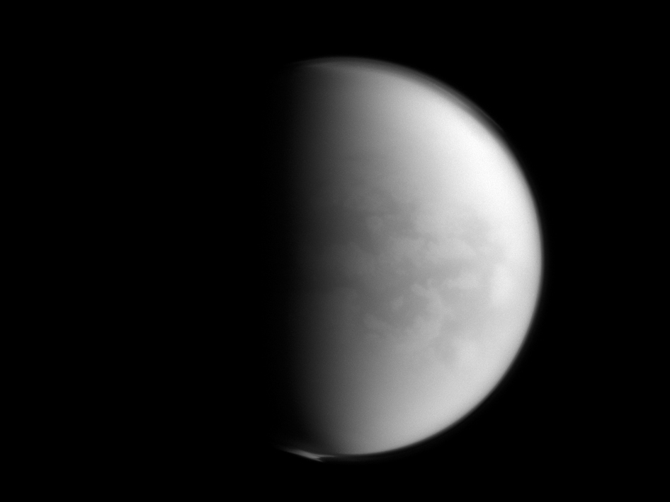 En estos momentos el satélite de Saturno se encuentra rodeado de nubes que no permiten observarlo en el rango de luz visible, por ello esta imágen fue obtenida por medio de las diferentes cámaras de alta precisión que operan en los rangos del Ultravioleta y el Infrarrojo a fin de poder observar su superficie.